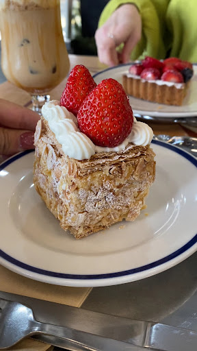 Read moreナポレオンパイ ミルフィーユと似ていますが、大きな違いは... 周りにたっぷりまぶされたローストアーモンドと、 トップにちょこんとのったいちご🍓 その華やかな佇まいから "お菓子の皇帝”と呼ばれるんだとか🫅✨️