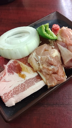 焼肉ランチのみなので注文せずとも、最初にお茶とお漬物、そして、お肉が運ばれてくるのですが、鶏モモと厚切りの豚ロース、牛の厚切りモモ(?)とロース(?)、ピーマン、玉ねぎ、それからキャベツ(別皿)が配膳され、お肉を焼いていると、よいタイミングにライスとスープが配膳されます。