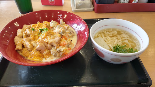 令和4年3月 うどんの取り扱いが無い〇野屋さんより好きなのでちょいちょい利用させて頂いてますがいつもは牛丼やつどんを頂いていて安定して美味しいし、特に感想を書く程では無かったのですが、今回はちょっと気になったメニューを頂いたので投稿させて頂きました。 あさりくりーむ親子丼と小うどんのセット800円を頂きました。 あさりの身はいっぱい入ってましたが食感のみであさり風味や旨みは感じられなかったです。 クリーム感も食感と言うか口の中ではクリーム感?(ねっとりとかそういう感じ)は有るのですがクリーミーな味的な感じは無くこのクリームが親子丼を消してて親子丼がクリームを消してる感じがして結局普通の親子丼食べたら良かったと思いました。正直美味しいとは思いませんでした。何故商品化した?試作や味見で会議しなかった?と思うレベル。不味くは無いが何を食べてるか分からない。