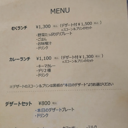 ランチはむくランチ1400円、カレーランチ1300円、ドリンク付き。 スコーンとプリンかコーヒーゼリーのデザートをつけると+200円です。 デザートプレートセットはドリンク付き1000円。