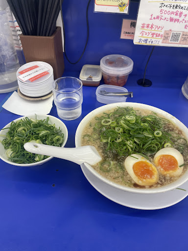 何年かぶりに訪問したら、店内リニューアルしたのか、座敷がテーブル席になって、カウンター席も綺麗になり、タブレットでの注文に変わっていましたー! 今日も暑いから、冷麺にしようかと悩みどころですが、やっぱり熱いラーメン! 今回は味玉ラーメンに、のりをトッピングしました。 麺はバリカタにしたけど、そんなに固くはなかったなー。 背油は少な目、ねぎ多め、辛さは普通で。 チャーシューが沢山入っていて、変わらぬ美味しさで安心しました☆ いつも他店ではラーメンとのりがもの凄く合うなと思っていたけど、今日はなんか違う? スープなのか? のりなのか? これは研究を重ねればならない課題ですな。 来来亭さんも色んなメニューがあるので、久々に来たらスイッチが入ったように、また来なければ! という思いなる(笑) ぎょうざも美味しくいただきました☆