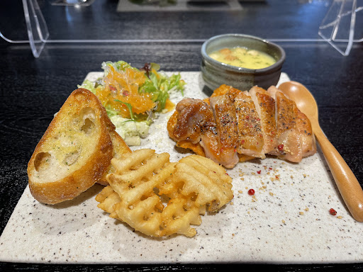 ワンプレートになっているので、 お料理が来るまでにやはり時間はかかってしまう。 ランチで回転率上げるためには仕方ないと思う。 特にこの時期は寒いので活気のないレストランは寒い。先にスープを出すなどの取組みはされた方が良いなと感じました。 コーンスープは、おそらくインスタントのものかなぁ 濃厚さやそのお店の特徴などを感じられなかったのでおそらくそうだと思います。 ま、ランチで、コロナもあり、お客様が減ってるとなると、インスタントでも仕方ないですね。 お料理全般は可もなく不可もなくといったところです。パンとポテトは一般的な味です。 チキンも何か特徴があるというわけでもなく、普通に美味しいです。チキンの下にリゾット?みたいなご飯が敷かれていたのですが、それがわりと冷たかったかも。冷たいものなのか、温めが弱かったのかがよくわからなかったのですが… 全体的にボリュームがないので、そのリゾットがあるのとないのとでは差がありそう。もちろん、あった方が良いですね。