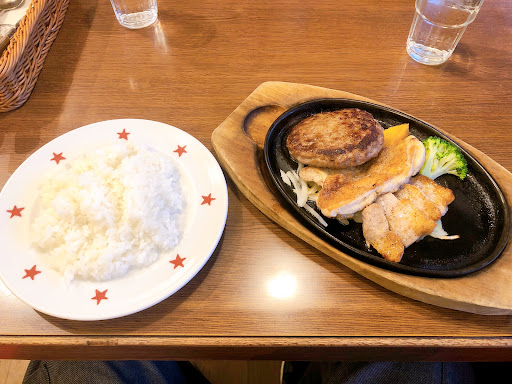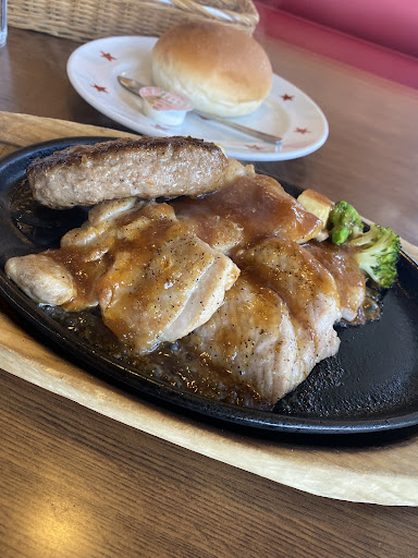Read more誕生日月ということでお昼奮発してLINE登録からの一応席予約で伺わせていただきました。 空調やや強い BGMもやや強めですが落ち着いた店内で喫煙スペースも端っこに付いていました(お手洗いは今回利用なし) 接客姿勢、商品提供共に早く悪くないですがソースが跳ねてメニューに付いちゃってたのが残念でした(開店すぐなので昨晩のかな?) ドリンクバーは他店舗と変わらず炭酸が弱めかなとおもわれ、スープ(オニオン)は濃口なので2杯目はいけず、、ライスも釜を開けて皿に移して頂きましたがもちっと感を感じたので水多め炊きでしょうか(やや固め好きな自分には特に感じやすいかと)今回ステーキ200+50で頂きましたが提供すぐは鉄板も熱かったですが直ぐに冷えていったのでフライパンで焼いたやつを乗せただけかな?と錯覚するくらいでした デザートに無料の誕生日ケーキをたのみましたがとても美味しく付属ミニスプーンフォークが冷たく夏場にはぴったりでしたね♪冬場はどうされてるんですかね🤔総合的にGoogleなどの平均値より上に感じましたが次回はお昼まえか夕方など時間帯変えて来店してみたいで...