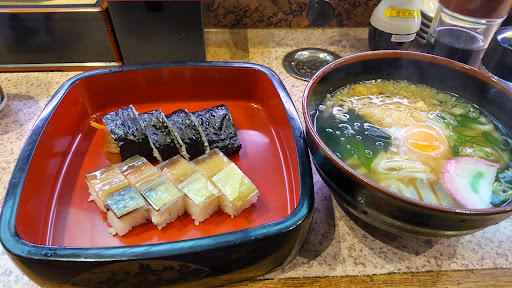 深井駅周辺で回転寿司を探していて、有名店舗に入ろうと思ったのですが、久々に個人店に入ろうと思い入店。 最初「あれ、失敗したかな!?」って思いましたが、ネタも悪くなくなかなか良い店でした。 店の雰囲気ほ少し暗めでいい雰囲気とはいえません。 ランチのうどん付きセットメニューがあります。 ランチセットは巻き寿司セット、バッテラセット、握り寿司セットとあります。 うどんは美味しい方のうどんです。 ランチセットの巻き寿司とかバッテラとかがいまいちよく分かりませんが、それが売りなら問題はないのかもですが、得に普通の巻き寿司とバッテラです。