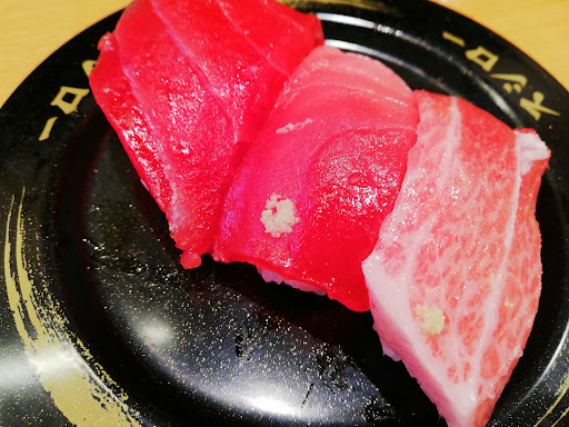 赤身から頂きます。 ジューシー感、旨味はそんなにありませんが2貫150円はありかな? 本鮪三貫盛り300円は赤身、中トロは同じ感じです。大トロは脂の分旨味が少し多いです。美味しいです。