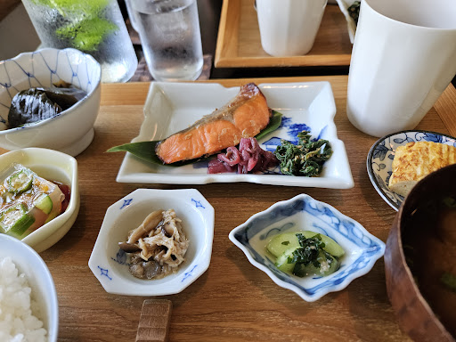 Read more緑に溶けんでいるような1件の建物の中は、やはりナチュラルな雰囲気で、どこの窓からも豊かな自然の風景が眺められる癒しの空間でした。 和食ランチはお魚をメインにどれも素材の味が生きていて、量的には女性で腹八分くらいじゃないかと思われました。 食後に頂いたラテは牛乳か豆乳を選べ、豆乳ベースのほうじ茶ラテにしましたが、豆乳独特のクセも感じられずコクがあってとても美味しかった。 イベントもいろいろ企画されてるようなので、また来たいお店です。 駐車場は広めで、止めやすいです。