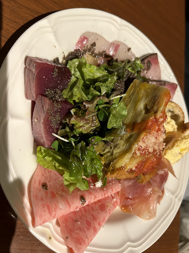 まず前菜から。 五つの種類が入ったワンプレートの前菜で、ひとつひとつが丁寧に作られているのが感じられます✨ 燻製卵のブルスケッタ、すごく美味しくて箱で食べたいくらいでした😋笑 お魚もあり、こちらも美味しかったです✨