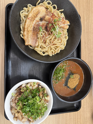 ずっと気になってたラーメン屋さんです。 本日頂いたのは 濃厚豚骨魚介つけ麺(3辛) 赤黒 ダブル チャーシュー丼です。 ランチタイムは麺大盛りが無料なのでどちらも大盛りで。