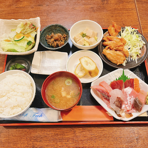 Read more素材も良いし、味付けも良い、文句なしにどれも美味しかったです。 お値段もお手頃ですね。 この辺りで夕飯を・・・と探していた候補のうち、タクシーの運転手さんもオススメのお店でした。早めだから入れたけど、予約しないと満席なこともありそうなくらい賑わってました。 常連さんが多い感じだけど、一見の私たちにもにこやかに接客してくださり、感じが良かったです。 刺身が立派で分厚くて(笑)。骨付き鳥は皮パリパリ身はしっとり。揚げとうもろこしは、コーンは甘くて絶妙な塩加減で、甘塩っぱくて。どれも美味しかったぁ。自家製梅酒も良いお味でした。 なお、揚げとうもろこしの美味しさに感動したらしく、私が離席している間にもう一回注文されていました(笑)。 夜も定食が選べたら、一人でもゴハンし...