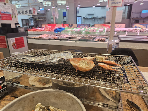 Food is fresh even though the red crab was freshly frozen, not live. Cooked crab meat was sweet and enjoyable. Had some sand in the scallops, may be they weren't left long enough in the salt brine for them to spit out all the sand. Red crab price ranged from 2,000 - 3,500 depending on the sizes. Crab is a must have here in order to make the Sakaminato trip worthwhile. Great...