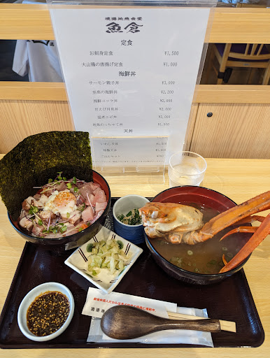 さて、今回お利用したのは定食屋さんの『境港地魚食堂 魚倉』さんで、『至高の海鮮丼』をいただきました。 海鮮丼は具の魚肉を四角くぶつ切りにしたもので、量は御飯1:具1の構成で朝食としては腹8分目と丁度良い感じでした。 そして味は、高いだけで残念な感じかな…って思ってましたが、良い意味で期待を裏切られ素朴に美味しかったです。 そして蟹味噌汁ですが、こちらは見た目通り(写真では分からないかと思います)残念な物で、完全に観光客向けのパット見た目重視な料理でした。 先ず、味噌をケチり過ぎて薄い。蟹の出汁は出ている物のインスタント食品の蟹雑炊の素以外の味。そして蟹はずわい蟹をしょうしている物の脱皮後少し経過した身がスカスカな蟹を使用している為、食べる身は殆どありません。