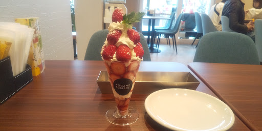 店頭の、のぼりに惹かれて… イチゴパフェを食べにお邪魔しました。 1,200えん。