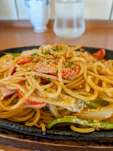 2024/04/14 12時30分初来店☺ ーーーーーーーーーーー カウンター 5席 小上がり 4人用が 3テーブル有り 入店時小上がりが満席 (激混みでした) カウンターでの食事☺ メニュー 沢山有り過ぎ! 名古屋名物 イタリアンスパゲティー 単品¥800オーダー セット¥1,000 スープ サラダ付き? ーーーーーーーーーー 御主人が1人で切り盛り しているのでオーダー時で 1時間待ち! ーーーーーーーーーーー 13時10分には食べられました(40分待) オーダーした スパゲティーと一緒に出て 来たのが?何やら怪しい 黒い液体 味変用? お好みで使用の事 (ウースターソース?) かけた方が 美味かった ーーーーーーーーーーーー 昔通ってた喫茶店を 思い出しました 鉄板の上に卵が しかれて その上に パスタ☺ 次回は¥700の焼きそばに挑戦します 駐車場は...