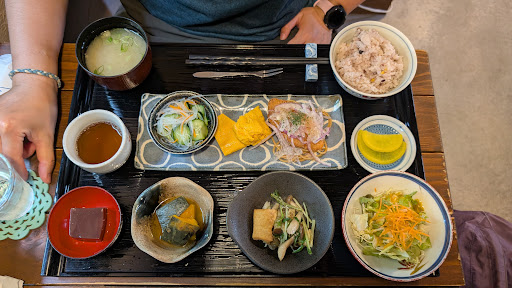 Read more週五的中午來,路上都沒什麼遊客,但店裡還是三三兩兩客人陸續來去。雖然我們不會說日文,老闆還是很親切的幫我們點餐,還寫漢字加上一點英文單字來溝通,讓人倍感溫馨。點了一個A餐一個B餐,今天的主菜分別是炸魚排及炸雞排,主食小小的但整份定食超級豐富,滿滿一碗飯,炸雞排下面墊了義大利麵,生菜、涼拌小黃瓜、味噌湯、玉子燒、煮物、南瓜、麥茶、紅豆糕,全部吃完超級飽,口味上是我一路走來吃到最清淡不死鹹的,覺得很棒。另外再點了一個酒粕布丁,布丁體超級綿密跟我想的QQ布丁完全不同,布丁有清酒的味道,上面淋的黑糖漿超甜,還有兩顆黑豆在上面,如果不加糖漿的話我會更喜歡一點。店裡的裝潢與環境讓人很舒服,木頭為主結構,牆壁塗料刻意沒有抹平,還有壁爐跟冷氣,木窗,看著外面大太陽覺得坐...
