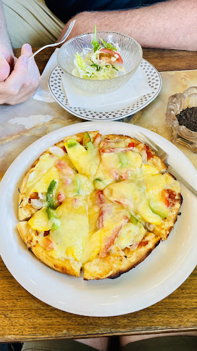 Read moreお盆休み中に来店しました。 以前夕方のテレビで拝見し、JBLの音響機械にこだわっており、コーヒーやトーストなどが美味しいと言う情報を得て、気になり行ってみました。 外観は、昔ながらという感じで商店街の中でなんとか生き残っているような雰囲気でした。 外階段の2階に上がり入ると、中からはいい感じのクラシックと共にコーヒーのいい香りが漂ってきました。 私はメニュー表にあったBコースのピザ+サラダ+コーヒーを頼み、同伴者は生ジュースのメロンを注文しました。 店員夫婦の口臭がやや気になったが、それは言わず、料理に期待し我慢しました。 先にサラダと生ジュースのメロンが届いたが、サラダは可もなく不可もなくという感じだが、生ジュースのメロンはメロン玉シャーベットやメロンボールという名前で売られているアイスと全く同じ味がして生ジュース感がなく、人口甘味料の味がしました。 続いて、ピザとコーヒーが届きピザの味も可もなく不可もなくという感じでややチーズが多めで食べづらく、ピザ生地が冷凍食品なのか火の通り方にムラがあり固いところと柔らかいところに差がありました。 コーヒーは唯一他店に負けないくらい味と香りとコクがあり、コーヒーカップがジバンシーであったことに驚きコーヒーはまた注文したいと思いました。 店内の印象としては、年齢層の高いお客様が多く昔からの憩いの場と言う空間にふさわしいと思います。 こだわりの音響機械については、トイレ横の席からカウンター席にかけて良い音の反響は感じられるが、窓側の席の方には音響機械がなく立体的な反響(サラウンド効果)的なものが足りないと思います。 席の印象としては、机と椅が低すぎ、前かがみにならないと飲食が出来ず、実に不思議な構造をしていました。 店内の清掃による清潔感はあったが、隅々まで清潔かと言えば、そうでもないような感じだと思います。 物が窓枠や店内の真ん中のスペースに多く、テーブルの上にあった角砂糖の入れ物の上にホコリが被っていたので気になりおしぼり等で拭こうと思いましたが、おしぼりのサービスもないこと驚きました。 次もし来店するとしたら、コーヒーとちょっとしたデザートを頼むだ...