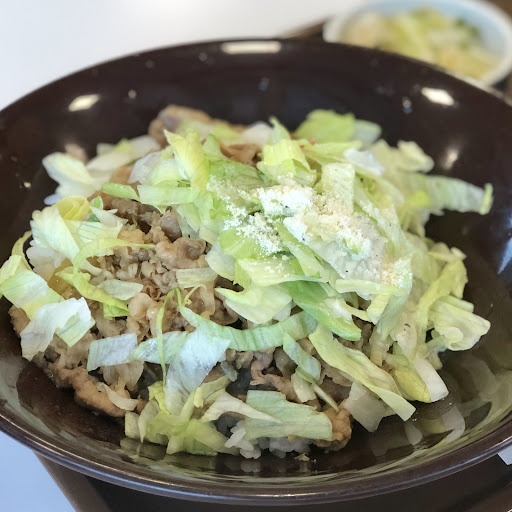 「シーザーレタス牛丼」500円 期間限定とはいえ、以前にも登場したメニューである。牛丼の上にレタス、粉チーズそしてシーザードレッシングというじつにシンプルな構成だ。生野菜好きにはたまらない。レタスのサクサクとシーザードレッシング、牛丼が意外にも相性がよい。