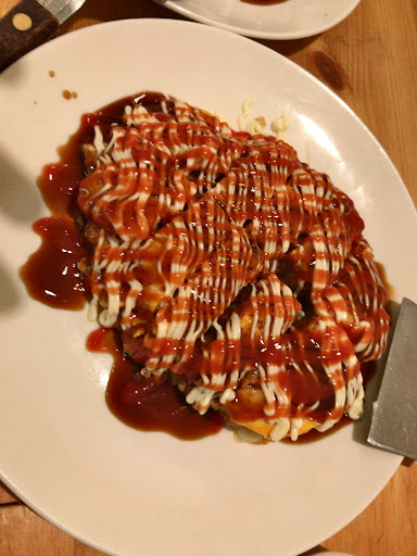 Read moreとても清潔で居心地の良い空間でした。 テーブル席で客も私達のみだったのでゆっくりできましたし食事の提供のタイミングは抜群でした。 最初に提供されたローストポークはとっても柔らかくまたタコとトロロのふわとろ焼きは名前の通りトロトロで美味しいたこ焼きのようでした。 ただ、最後に注文したお好み焼きが残念でした!子供の頃大阪で暮らした者2人、仕事で広島に滞在していた事もあり美味しいお好み焼きは随分食べて来たと思います。で、その私達からすると粉が多すぎる!絶対的に! 粉が多ければお好み焼きをキレイに形良く焼くのは楽チンですがモッサリしてしまって全く美味しくないのです! 3種類のお好み焼きを注文したのですがどれも同じでした。ただ美味しいお料理もあったのでもし次回伺う機会があればもっとお肉...