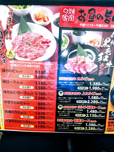 Read moreランチタイムに初めて訪れました。お店は大きく、駐車場も広いです。 信州黒毛牛のカルビランチをオーダー。お肉は程よく厚みがあり、とてもやわらかくて美味しい。1500円以内でこのランクのお肉は、かなりコスパがいいと思います。 夫は上カルビを食べたのですが、脂が多かったと言っていました。そこは人それぞれ好みですが、脂が好きな方は上カルビ、肉そのものを味わいたい方はカルビがいいのではないでしょうか。 ランチのライスとスープはおかわりし放題で、夫はライスを一杯目は普通におかわりし、二杯目はスープをかけて、おろしニンニクと焼いたお肉を加え、焼肉スープ丼にして食べていました。 夜にもぜひ...