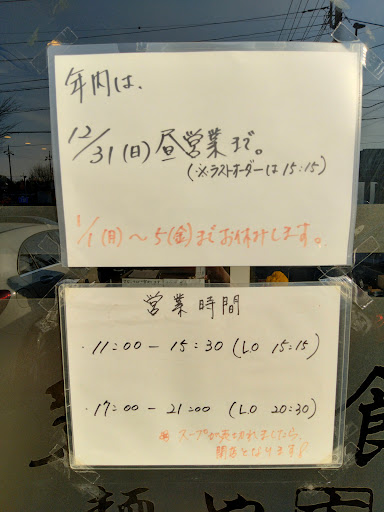 ■2024年12月31 日(火) 11月に2回訪れ、12月は大みそかに今年最後の来店となりました。 今日営業しているか分からなかったので、事前に電話で確認。11時過ぎの忙しい時間帯にもかかわらず、丁寧に対応して下さって、改めて感謝。お昼は営業しているとのことで、食べたい欲もMAXに♪ ※年明けの営業時間は、お店の入り口に貼ってあったメッセージを写真でアップしています。もし宜しければ、ご覧になって下さい。(アップした写真なんですが、新しい写真順で並び替えすることができなかったので、最後の方の写真が2025年度版になります。くれぐれもご注意ください。) っということで、12時過ぎに到着したのですが、運良く第2駐車場(!?)が1か所空いていて、無事に停めることができ、入店♪♪ &すっごくラッキーなことに、5分と経たずに着席することができました♪♪♪ っで、いつもは、お決まりの【蔵出し醤油ラーメン(まったり)+半本鮪丼】を注文してるのですが、今日は初めて【中落ち丼と半ラーメン】を注文。 実は、毎回注文しているメニューだと、最近お腹いっぱいになることが多くなってきて・・・ 年ですかね・・・ そこで、お魚のどんぶりをメインにすれば、少しは、い~感じに食べれるかなと。 &以前お店の人もオススメしてくれたんですよね。 っといいことで、結果、これが大正解! あっさりと食せる工夫が色々とあって、少食になりつつある私でも、めちゃくちゃ美味しく味わうことができました!! お店の皆さんに感謝するとともに、来年も宜しくお願い致します。 それでは、みなさん、良いお年を!!!