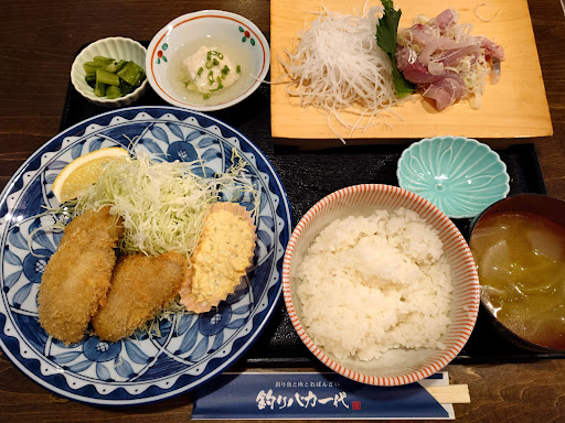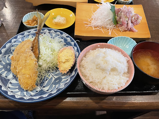 A set meal where you can enjoy fried horse mackerel and sashimi. The inside of the shop is not so large. There are counter seats facing the kitchen and table seats along the wall. The horse mackerel is a rare type called "golden horse mackerel", and the taste is also...