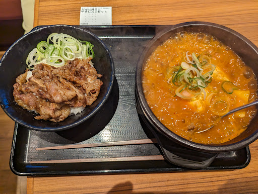 Read more18時頃来店 注文は券売機方式(追加は店員さんに直接も可能) 店内はセルフサービス テーブル席多数で店内は広々 券売機で購入すると自動的にキッチンにオーダーが入り食券の番号で呼ばれるサービスエリアみたいなシステム チゲと丼は別の調理場で調理しておりオーブンキッチンのため様子がよく分かる 目につく箇所に調理してるので時間かかりますと記載されているがそこまで待たされている感はなくテキパキと調理がでてくる ・牡蠣チゲ(辛さMAXチーズトッピング) 調子にのり辛さMAXを頼んだ チゲ自体はあっさりした海鮮の風味牡蠣は小さめなものが4-5個入っていた正直牡蠣じゃなくても良い感じだった 辛さに関してはMAXにしたため一口スープを飲めば汗が吹き出し唇が痛くなる 追加でチーズトッピングをお願いし何とか完食 美味しいが辛さMAXは強者にしかオススメしない ・カルビ丼(肉増量大盛り) 大盛りと言っても牛丼チェーンに比べると小ぶり肉増量はしっかり増量されており カルビは肉厚でジューシータレは甘ダレでご飯にもかかってしみしみ 値段はちょい高めだが値段相応の味