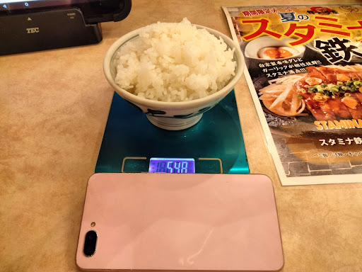 注文後すぐにご飯大盛りだけが運ばれて来たが、その意図は未だに分からない。 とりあえずやる事もないので そのご飯大盛りを計量する事にした。 直径約1cmの小さめのプラ製の丼には程々の量のご飯が盛り付けされている。 キッチンスケールで計量すると548g、食後に空の丼を計量すると297gの数値なので実質の量は251gある。