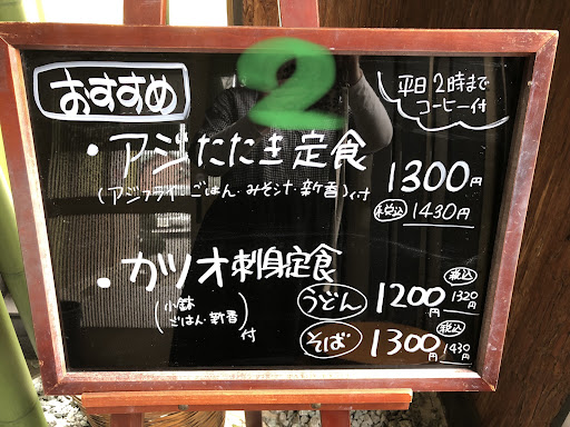 Read more月曜日定休日。今日はランチで来ました。入り口のカツオとうどんのランチ(写真あり)と鯵のランチ(写真あり)を注文。コチラ入り口にあるメニューはランチはコーヒーがつくだけで値段は変わらないようです。夜もこのお値段。2の写真。お刺身が美味しかったです。おうどんは今回コシもあり美味しかったです。2人で来ると色々食べられて大満足です。夜も大して値段は変わらないので(数百円ぐらいしか違わないと思います。夜千円以上変わるお店も多い中ありがたい)安心して入れます。 ココからは前回。美味しかったです。以前から気になっていて、やっと行けました。入ると店員さんの対応もよく店の雰囲気も◎。混んでいるので少し待ちましたが、納得のお店です。テーブルや椅子も綺麗にしてあって店内も綺麗、女性トイレも借りましたが綺麗にされていました。 食事は、入り口に記載があったアジの定食(正式には細かく書いてあったようでしたが忘れてしまいました)と、穴子天丼セットを注文。お値段も手頃です。アジの定食は 半身ずつ お刺身とフライになっていました。お刺身は姿作りになっていて、よくある定食のちょっとしたお刺身とは違い、ガッツリ美味しく頂きました。新鮮で美味しかった。フライもサクサクフワフワで美味しかったです。穴子天丼も品が良いタレ具合(しょっぱくなく)でペロッと食べてしまいました。お値段以上でとっても満足です。ちょっと家からは遠いのですが、頻繁に行ってしまうと思います。今までアジを食べに千葉まで行っていたのがなんだったの...