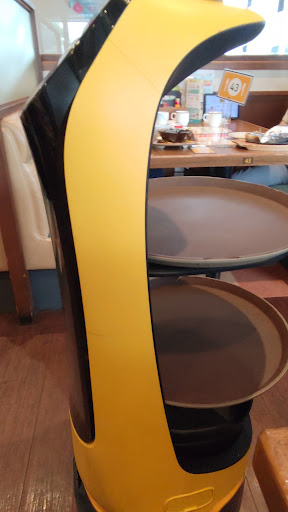 [配膳ロボット‼️] 『ロボットがお料理をお届けする場合がございます』の表示があったけど、ホントにロボットが料理を持ってきた。ヌルッと近づいてきたから最初驚いた💦 料理を取り出して頭部の「完了ボタン」を押すと戻っていく。なんか不思議…っていうか、ちょっと不気味な感じがした😅面白くて良いと思うけどね。