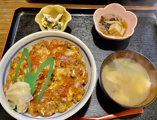 ある土曜日の12時過ぎに来店。 空いていたのは、6人がけの小上がりのテーブル。申し訳ないと思いつつもどうぞと。ありがた過ぎて、後からいらした複数人のお客様に席をお譲りして、自分は、大将の前のカウンター席に移動しました。 一番人気のめだか丼をいただきました。お昼の混み合う時間帯に加え、テーブル席にやはり5、6人のお客様がいらっしゃり、着丼には20分?くらいかかりましたが、それを上回るだけの美味しい丼でした。 鮪とイクラのマリアージュ❣️素晴らしい発想ですよね。 海鮮好きで、普通のお刺身以外の珍しいお食事をされたい方には、ぜひに おすすめです。 …お隣の方が召し上がる、お刺身やお寿司も美味しそうで、次回は!です。 盛り付けが丁寧で美しく✨一番のごちそうです。 あ…大満足の完食後、大将に、 …おねえさん、おねえさん、ご飯つぶが と教えていただいた還暦過...