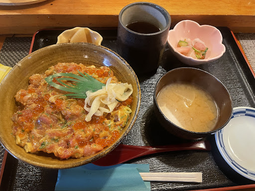 めだか丼は、刻んだ卵焼きの上にマグロ中落ちと数種の海鮮、いくらを混ぜ、オリジナルの味付けをした美味しい丼でした。煮物は少し甘い味付けで汁は具沢山のアラ汁でした。 凄くお腹が空いた時にまた伺います。