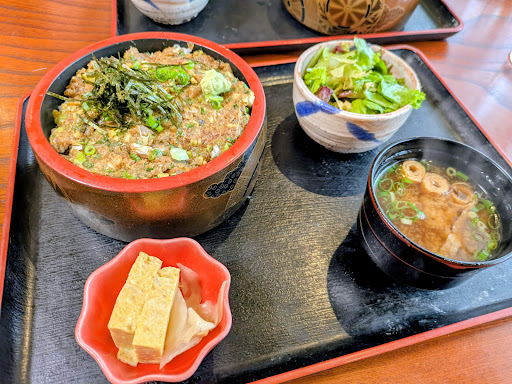 Read more住宅街に佇む老舗、駐車場はお店の横に数台駐車スペース有り。 敷居が高いかな?と変な緊張感が有りましたが、とても感じの良い板前さんでそういえば電話対応も優しいかったです。 一歳の子供を連れて行ったのですが、座敷は掘り炬燵で子供用に豆イスやバンボが備わっていたので助かりました。 女性の従業員さんも気にかけてくださって、子供連れの変な緊張感も無くなりとてもリラックスしました。 メニューは期間限定メニューや、ランチメニュー、揚げ物や名物なめろうまでとても豊富で迷いました! 海鮮丼を頼みましたが、ご飯の量が選べて嬉しかったです。 なめろうは辛味有りと無しで選べ、私は欲張って両方頼みました。 鮨飯も、なめろうも、魚も、セットの卵焼きも全て美味しかったです! 卵焼きはお持ち帰りメニューにもあり、人気メニューらしいです。 少し甘めの味付けで好きです! お値段も高過ぎず、変に安くもなく、このお味なら安いと思います。 大変満足出来ました、近くに行ったらまた行きたいです。...