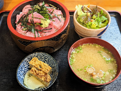 メインの生マグロ丼到着〜🐟💨 ランチタイムにはサラダ、みそ汁、玉子焼き、デザートがサービスでセットになっています😄 生マグロはすーっと歯が抵抗なく入り、柔らかさと鮮度がエクセレント👍 酢飯の酢の塩梅もバッチリであれよあれよとマグロとお米が私の胃の中にgo to...