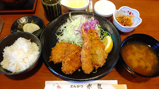Read more以前前を通った時に気になっていたとんかつ屋さんにやって来ました。「とんかつ水龍」オープン時間に少し早かったので、近くの寒川神社にお参りして体調万全!15分前に一番乗りで外に既に出してあった表に名前と人数、座席の希望(カウンターかテーブル)を記載して待っていました。10分ぐらい前から続々とお客さんが現れて、オープン時間には6組ぐらい10数名がいらっしゃいました。私が一番に案内されましたが、その後も続々と新規客が入って来て1階は直ぐに満席、2階はどうなっているか分かりませんが、そちらに通されていました。メニューにはとんかつ以外のランチメニューや肉の量を減らして違う揚げ物とセットにしたりと飽きさせない工夫が感じられました。私は上ロース一択でアジフライ200円を追加しました。 ホールと調理場とのやりとりがその場から直接声で指示、確認されるやり方で、いい意味で活気が有る。悪い意味で何でも筒抜けと感じました。 さて料理が運ばれて来ましたが、壁に書いて有るキャベツのドレッシングは何処に有るのか確認したら、「どれになさいますか?」って品物運んで来た後に聞かれるので、普通オーダー時に確認するべきと思いました。オーダー時に聞かなければドレッシングは並んで持って来られると思っていたのでチョットがっかり。 しかし、肝心のお肉は上ロースの香りがラードの甘い香りに包まれ美味しかった。沖縄久米島の塩を使ってみましたが、一度騙されたと思って試して欲しいですね。ご飯お代わり自由は有難かった。 ただ私個人的な好みのせいかもしれませんが、アジフライの衣が大きいサイズのパン粉を使われていて、結構しっかりと付いていて少し焼いたパンを食べている感じでチョットこれはと感じました。できればとんかつと同じ細かいパン粉の方が好みかなと思いま...