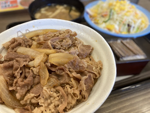 2022.3.27 牛丼並盛+生卵&豚汁(味噌汁から豚汁に変更)+お新香を更にボタンを押し間違えてもう一つ豚汁を注文(^^;)。 牛丼はなんだかタレの旨味もなく久々だっただけにガッカリ感が強まりました(´Д`)ハァ…。 豚汁自体はまぁまぁの美味しさでしたが、やはり量が多く、完食するにはやや苦労しました(^^;)。 牛丼には紅生姜をソコソコ投入して、ライスを豚汁に投入したりしてキッチリと完食しましたが、どこか物足りなさも感じました( ・ั﹏・ั)?。 券売機も松の家ほど使いづらくは無いものの、ちょっと使いづらいかも( ・ั﹏・ั)?。