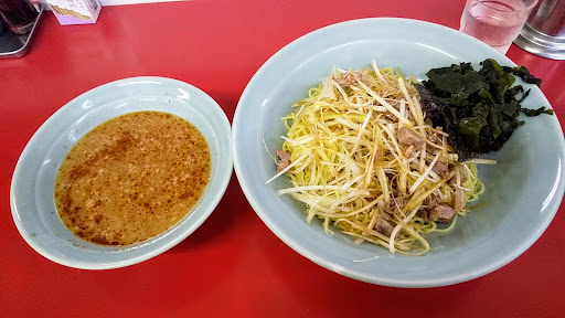 2020.7.5 ネギつけ麺中盛950円を好みは全て普通で注文(°▽°)。 スッカリと通常営業に戻った感じ(^-^;。 ラーショは麺量が多い・・・と言ってもつけ麺にすると若干ボリューム的には物足りなく感じられてしまうので中盛で食べてみました( ̄▽ ̄;)。 麺はいつものラーショらしい細麺だが、水で〆られてから提供されるので通常のヤワヤワ感は然程感じない( ・-・)。 ネギのゴマ油とタレが麺に行き渡っているせいか以前食べたときに感じられた麺のくっつきもなくとても食べやすかった(゜-゜)(。。)。 スープは豚骨醤油ベースにラー油的なものが多少入れられており醤油ダレも当然の事ながら濃いめ。 熱々で提供されるが中盤以降は・・・😓⁉️。 こればかりは仕方ないですね😅❗️。 途中からはコショウ・ニンニク・豆板醤・ラー油を投入して、〆にお酢も注いでキッチリと完食(^-^)v。 好みの上では油多め(背脂)でも良かったかも(--;)?。 しかしながら接客も丁寧で美味しく頂けた(゚∀゚)。_。)。 暑い時期にはつけ麺も良いかも(°▽°)。 ★4つ