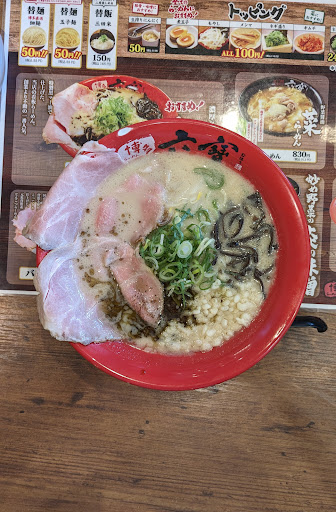 Read more屋台豚骨ラーメン680円、唐揚げ3個セット350円、生搾りにんにく50円、替玉80円を注文。合計1160円に消費税が乗って1276円でした。一応メニューに消費税の値段表示はありましたが全体的なコスパ悪いですね。注文は全部タッチパネルでやります。麺の硬さ調整が6段階ありました。博多ラーメンなのに辛子高菜が無かったのは驚きました。この値段設定なら無料で食べ放題やないとあかんレベルやと思うわ。ニンニクが有料50円でしかも綺麗に絞れない設計ミスやと思われる道具です。ニンニクのカスがやたらと残って嫌でした。何でもかんでも細かくトッピング扱いやった。ねぎ山盛りが240円?ぐらいでマジでありえん思ったわ。ラーメンは旨かったけど全体的に高すぎる。替玉前提で麺が少ないと感じたわ。他店と比べて80%ぐらいしか麺の量無いよな?替玉80円(税別)やけど量が少ないもんなって印象です。ライスもあの少ない量で単品150円とかありえんわ。小生の体感的には100円やろ。唐揚げは普通やった。水ピッチャー各席完備で荷物用バケットあるのにスタッフがバケットを持って来なかった。これセルフバケットなん?ってスタッフの印象悪いです。店舗は国道176号線沿いで駐車...