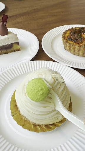 生ケーキはお店の奥のショーケースにびっしり並んでる。 やっとここまでたどり着けたのにまだ悩ますん? ってぐらい種類豊富! 行った時期はマンゴー、メロンとか季節を感じるフルーツから、チーズケーキ、チョコケーキ、シュークリームまで数え切れんぐらい沢山ある。たくさんすぎて数えるの放棄した。ごめんやで。 体感ではデパ地下のスイーツ売り場のケーキより多い。 即決即断のわたしがめっちゃ悩んだわ〜。 優しくて親切な店員さんがいはったから何がおすすめか聞いて、季節限定のメロンモンブランと、販売されるときとされないときがある幻の苺のプリンセスってケーキにした。 プリンセスって言ったらわたしやん???(だまれ) 食いしんぼうやからキッシュも頼んでしまった、、。 キッシュもチキン、お茄子、サーモンとか色々種類あったけど海老にした〜。