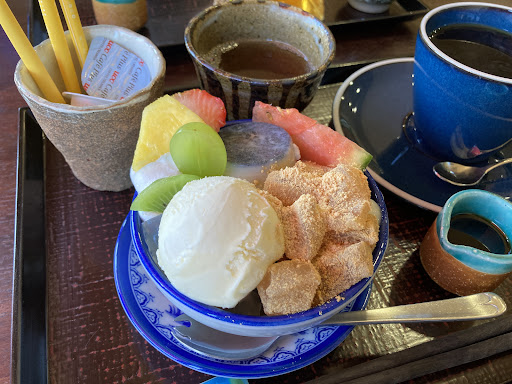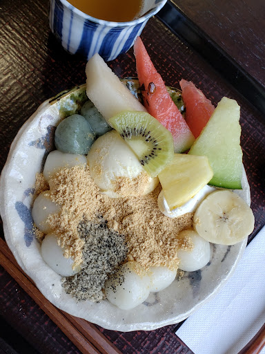 友人はあんみつ(切れてるけど写真奥)を注文していました。 こちらはフルーツもりもりで、分けてもらった抹茶寒の抹茶の風味が濃厚でした。