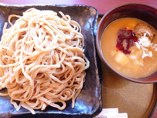 「辛つけ麺「極」」は濃厚なつけ汁です。 辛味も強いのですが、山椒系の痺れも強く、かなり人を選ぶつけ麺です。 痺れ系が苦手な連れは完全にアウトでしたし、個人的にもバランスが悪く感じました。 このお店の客層を考えても、もう少し万人受けするような辛さにした方が良い気がします。 提供時には辛味と粉が分離しているので、店員さんに小皿をもらってそこに出してしまえば良いのかもしれません。 つけ汁が濃厚なのは良いとしても、大盛りにして麺をつけ汁にたっぷりつけて食べるとつけ汁が足りなくなるので注意です。 提供時にスープを薄めて飲む用の割スープを持ってきますが、つけ汁は塩気が強めなので、初めからちょっと割るのも良いのかもしれません。 できれば大盛り時にはもう少しつけ汁の量を増やして欲しいですが。 麺はスープがよく絡むように考えてなのか断面がH型の麺なのですが、これが水分の切れを悪くしているのか麺の水っぽさが気になりますし、食感も良いとは言えません。 トッピングはスープの中に角切りのチャーシュー、メンマが少々、あとはつけ汁の底に玉ねぎが沈んでいるくらいで寂しいです。 価格を考えると割高感は否めません。