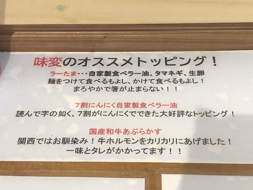 まぜそば専門店になります。 食券機で食券を買い、その食券に書いてあるトッピング希望量をペンで丸く囲んで店員さんに渡す方式なので初心者にも分かりやすいかも。
