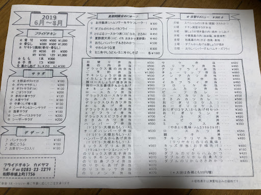 Read more近所のクレープ屋さんを目指して目的を達成その際、フライドチキンの看板が目に入り 昼食後のデザートにクレープも、お腹はパンパンでもどうしても気に成り、メニュー表とお弁当の写真を目にしたら、どうしても食べたくなりました。その間にもお客さんの出入りはひっきりなし❗️地元の人がこれだけ来るなら美味しいはず❕意を決して入店し唐揚げを注文しました。300円500円1000円と購入出来るらしく、数を聞いて今回は500円を購入しました。500円で6・7個先ずはサイズが大きめなのにびっくり❗️揚げたてサクサクでジューシーでお腹パンパンなのにペロリと頂きました。メジャーなフライドチキン店は それとして美味しいですがで、カメヤマさんの唐揚げはそれにも負けず劣らず美味しかったです。また近くに出掛けた際は立ち寄りたたいお店です。次はお弁当も購入し...