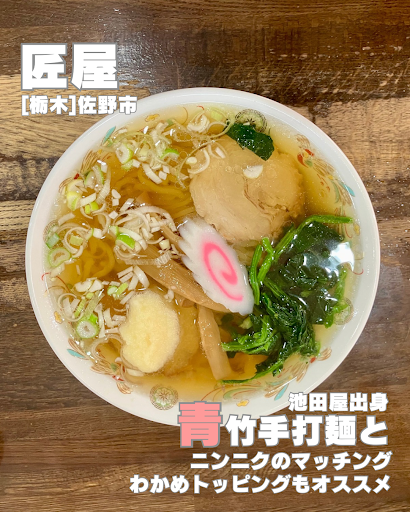 匠屋@栃木県佐野市吉水駅前3-4-10 どうも、さぴおです ✍️にんにくラーメン 880円 ______________ 🍥ポイント ✅動物のガラ感、醤油が香る青竹手打ちの佐野ラーメン! ✅池田屋出身!おすすめは『わかめラーメン』とのこと… ✅長めの青竹手打ち麺がニンニクの香気を引き立てまくります!  ̄ ̄ ̄ ̄ ̄ ̄ ̄ ̄ ̄ ̄ ̄ ̄ ̄ ̄ [点数] 81点...