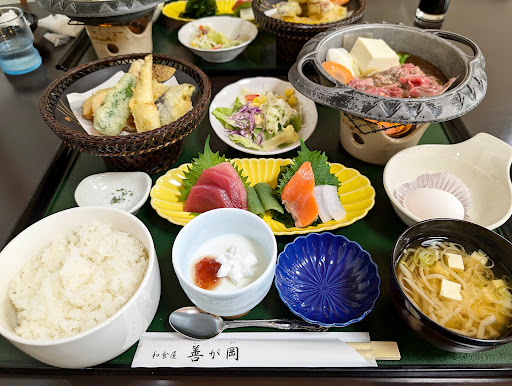 Read moreチワッチ😸【和食屋 善が岡】 すき焼き、刺身、天ぷら、和食料理の大好きが一度に味わえ楽しめる、そしてお値段もランチタイムなら1100円とお得に食べられます和食屋、よっよっ善が岡😺 数多くのメニューを目の前に まるで旅館やホテルのバイキングみたいですね。ここで重要なのは食べる順番とペース配分。すき焼きは火が通るまで時間がかかるゆえ優先するのは天ぷら。 当然ながら出来立てを味わうのが美味しく食べるコツと食材への感謝。ワカサギ、ピーマン、カニカマ、ナス、カボチャ、さつま揚げ、塩を付けて食べる天ぷらは天つゆとはまた違う美味しさ。塩は指で一摘み天ぷらに まんべんなく振りかければ均一に塩がかかりますが、早く食べたかったから付けて食べましたけどね。 刺身も美味しく、黒から揚げは佐野名物いもフライに使われるソースで、ソースのしょっぱさとフルーティな味わいで新しい発想のから揚げです。 グツグツと煮立って来たら すき焼きの合図。長ねぎ、人参、こんにゃく、絹豆腐、これらを青と例えるなら牛肉は黄色、そうして混ぜて新しく出来た色に緑と名付けた それがすき焼きだ。料理とは食への探究心、歴史に名を残す偉人達も...