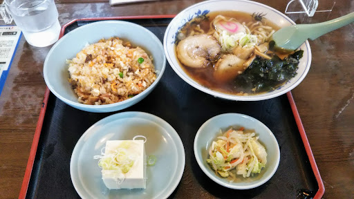 ・ラーメンセット980円(税込) 醤油ラーメン、半チャーハン、冷奴、漬物のボリュームが有るセット内容です。 メインのラーメンはチャーシュー2枚、メンマ、ナルト、ワカメ、ネギの具材。 鶏ガラと豚の動物系スープは後味に昆布の旨味を感じる塩味が濃いめの醤油味。 麺は縮れが弱めの青竹手打ち縮れ中太麺で硬めの茹で加減で喉越しが良いです。 2枚の豚バラチャーシューは軟らかく臭みの無い口当たりで美味しかったです。 パラパラ系の半チャーハンはチャーシュー、玉子、ハム等と具沢山な内容です。 街中華的な味わいの半チャーハンは鶏ガラと醤油の懐かしい味わいでしたね!