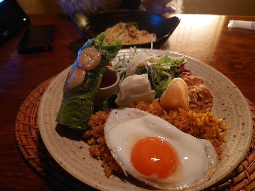 外観は日本の古民家と南欧の石造りの見事なキメラ、低い間口をかがんで店に入る特別感、仄暗い照明、見事である。実質的にはファミレスとチェーン居酒屋のキメラを照明の力で一段二段三段ほど昇華したような店舗である。しかし一見して素人にはそれを感じさせない程度には十二分に上手く仕上がっているのがこのお店の素晴らしいところ。飲食店関係者、施工関係業者なら視察の価値は十二分にある。