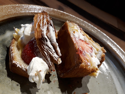 Best sourdough I've had in Japan. I had the strawberry mille-feuille, it was delicious. Lightly sweetened whipped cream, a velvety creamy vanilla custard, small tart strawberries, a buttery flaky crispy puff crust. The pâtissier is an artist and flavors were balanced. To drink, I ordered an Americano, well-brewed, dark chocolate notes, slightly fruity, nutty and delicious. If their pastry and coffee was that good I had to order the sourdough loaf to go. It is the best sourdough I've ever had in Japan. It isn't a Japanese style fluffy loaf. It is a flavorful sourdough loaf. Came home and ate half. Toasted with butter and gouda. It was crispy, crunchy, and everything you want in a sourdough. The crumb is scrumptious and the crust was perfect. If you love sourdough, you'll love this place. Many reviews talked about the price, it is in my opinion worth it. The baker has taken so much time and work to make a healthy and delicious loaf of bread that has taken days from start to finish. You are buying art at a great price. Highly recommended! I will be back. Definitely support...
