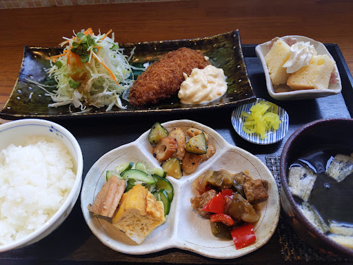 土曜日のランチタイムに電話で確認してから行きました。 土曜日も日替わりランチがあります。 座席を予約しますかと訊ねられましたが 予約はせずに行きました。 しかし、 行ってみたら駐車場は満杯、 テーブルも満席! しばし車で待機して数人お客さんが出た後、再度チャレンジして入れました。14時前でしたがランチはギリギリセーフ。 本日のランチは生姜焼き定食。 味付けは薄味で、おすましと副菜も色々付いてドリンク付きで900円。 男性には量が足りないかも。 ホットコーヒーは挽きたてでした。 ランチタイムは禁煙ですが、14時からは喫煙可。 お手洗いは個室が2ヶ所。いずれも綺麗でした。 陶芸教室も併設されているようで、コーヒーカップやお皿等、ギャラリーがあり、購入可です。 伺った時は年齢高めの女性客が多かったです。 接客も気持ちよく、...
