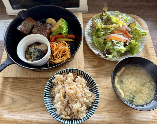 ▶︎感想 食事の写真とメニュー表を載せておきます。 玄米ご飯はおかわり自由なので1度おかわり。 ボリューミーでお腹は膨れましたが、再訪はないかな。 良くてコーヒーとかドリンク休憩(テイクアウトして横のロビーのソファで飲むのが良いかも)。 ちなみにパスタは瓦そばみたく、焼きカリっ...
