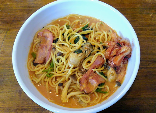 Read more最近、スパゲッティにハマっていて、先日のにれに引き続き、またまた検索して見つけたお店へ行ってきたわけです。 ゆであげスパゲティパスタさん。 はじめてきたので何がいいのかわからず、感と勢いでメニューの左上から星印のスパゲッティを注文しました。 トマトソースのシーフードスパゲッティ大盛りです。 昼時でしたがわりとすぐに運ばれてきました。