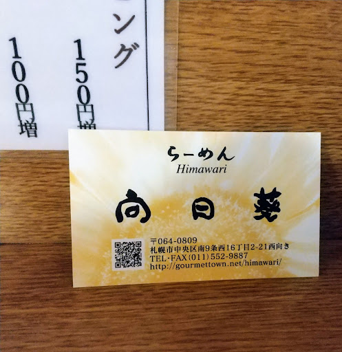 向日葵は、幌西地区には無くてはならないラーメン店です。どの種類のラーメンを食べても外れはありません。ご主人の丹精込めたスープは、赤みそ、白みそ、しお、醤油どれも満足のいく味です。脂は控えめで旨味がじわっと伝わってきます。カレーラーメンも、後乗せですので、カレーと麵を自分なりに組み合せて頂けるのも嬉しい一品です。森住製麺の麵との相性も抜群のスープは、御主人の信念の賜物です。夏でも辛みそが売れるという本格派のラーメン店です。定休日は水曜日です。